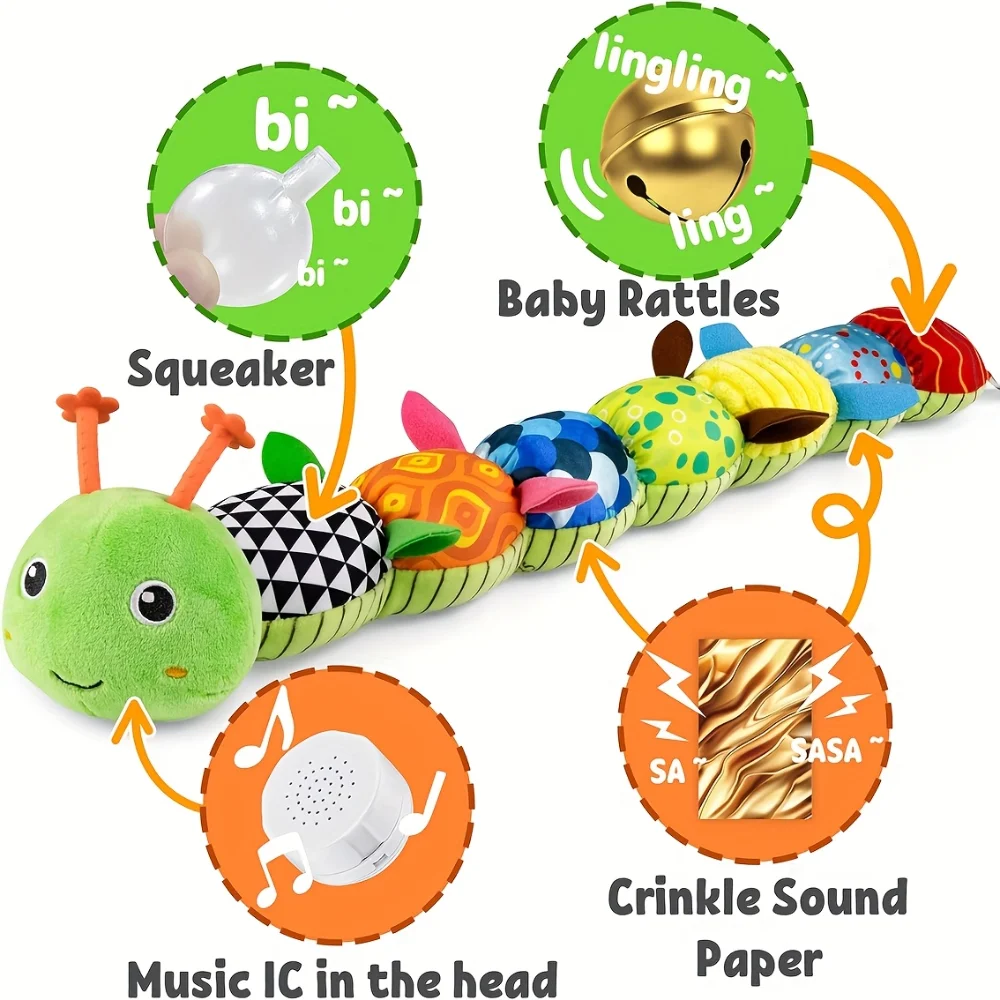 【Brinquedo de pelúcia para bebê 5 em 1】O brinquedo de pelúcia para bebê pode ser usado como um brinquedo musical para bebê, um brinquedo de chocalho, um assento de carro e um brinquedo de carrinho, um brinquedo de pelúcia de animal e um brinquedo de desenvolvimento sensorial.O brinquedo Caterpillar jingles, enruga e toca música para a diversão do seu bebê.Detalhes elaborados de design permitem que este brinquedo desempenhe muitos papéis e acompanhe seu bebê em diferentes cenas.O bebê pode exercitar sua capacidade de apoio ao brincar de bruços.Os 3 anéis podem exercitar a capacidade de compreensão do bebê.